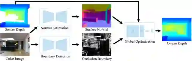 给定输入RGB-D图像,我们根据颜色预测曲面法线和遮挡边界,然后利用由输入深度调整的全局线性优化求解输出深度。