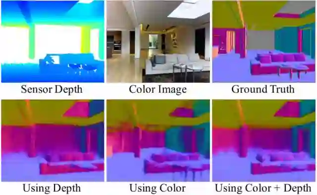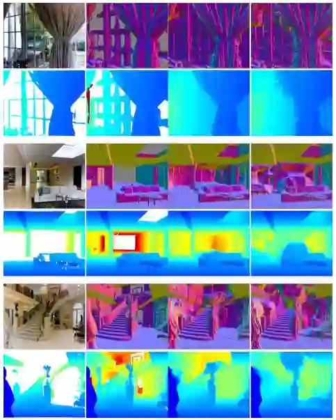 第一行显示输入彩色图像,原始深度和渲染法线。 最下面一行显示了输入仅为深度时的表面法线预测,仅显示颜色和两者。 中间一个对失踪区域表现最好,而其他两个模型在其他地方可以与其他地方相媲美,即使没有深度作为输入。