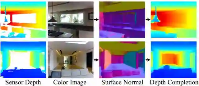 通过从颜色预测法线,然后求解完成的深度,我们在RGB-D图像的深度通道中填充大量缺失区域。
