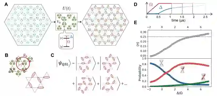 量子自旋液体是具有拓扑顺序的奇异物质相,在过去的几十年里一直是物理学的主要焦点。这种相具有长程量子纠缠特性,有可能被用来实现稳健的量子计算。该研究使用具有 219 个原子的可编程量子模拟器来探测量子自旋液体。在此研究中,原子阵列被放置在 Kagome 晶格的链上,并且在里德堡 blockade 下的演变创造了没有局部秩序的受挫量子态。该研究为拓扑物质的可控实验探索和保护量子信息处理提供了可能。
