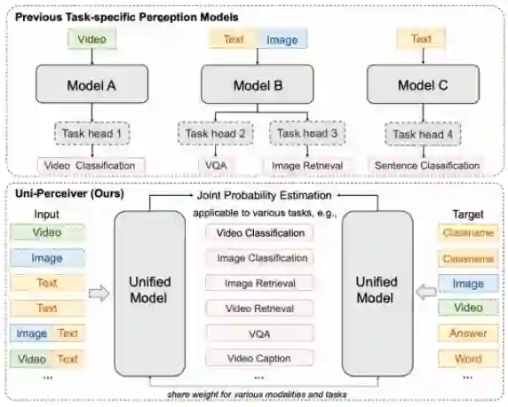 图 1 现有的特定于任务的感知模型和 Uni-Perceiver 的比较