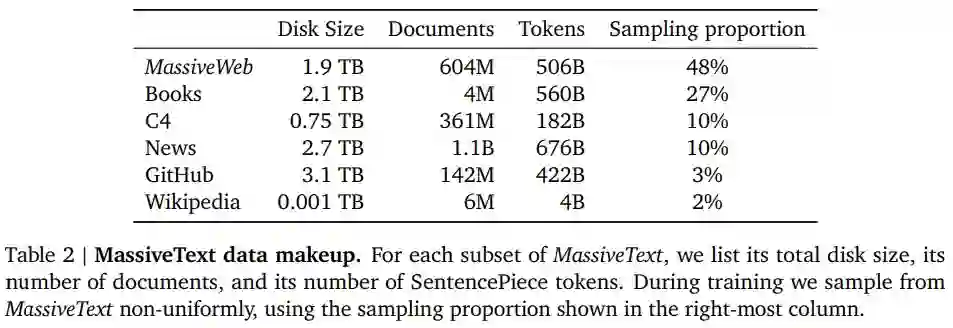 DeepMind 在 MassiveText 上训练 Gopher 模型家族,MassiveText 包括网页、书籍、新闻和代码等文本,包含约 23.5 亿个文档, 10.5 TB 的文本量。表 2 详细列出了该数据集。