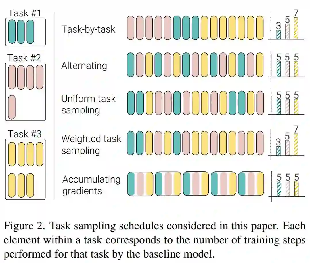 在协同训练过程中,对于每个 SGD 步,研究者采样一个任务(或数据集),然后采样来自这个任务中的 minibatch,评估梯度并随后执行参数更新。需要着重考虑的是采样任务的顺序以及是否在不同的 minibatch 和任务上累积梯度。研究者在下图 2 中描述了几个任务采样计划,包括如下: