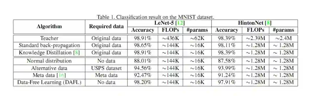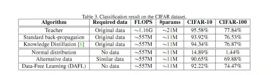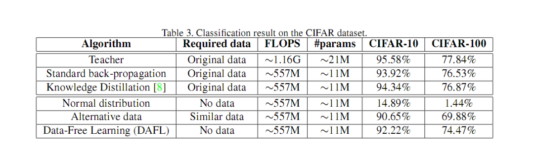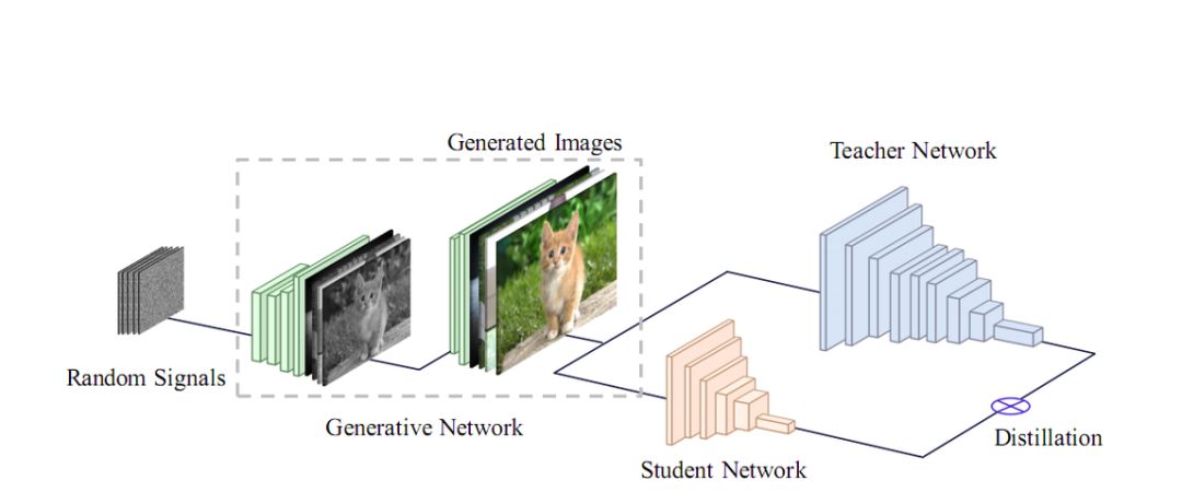 通常来说,知识蒸馏需要原始训练数据的参与,才能达到一个较好的蒸馏效果,那么在缺乏原始数据甚至无数据的时候,或者,老师模型只知道接口不知道其模型结构的时候,如何才能达到一个蒸馏的效果呢?此文章的出发点就在此,文章利用 GAN 生成图像的特性来生成蒸馏所需数据。