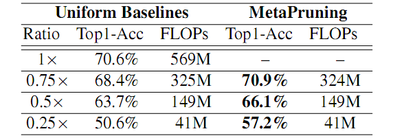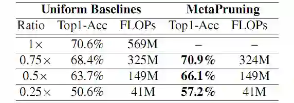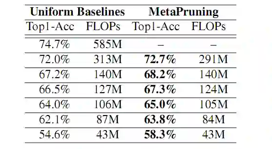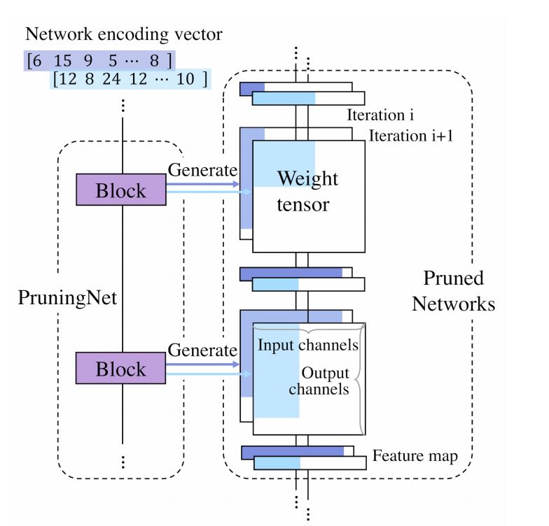 本文提出来一个 Meta network,名为 PruningNet,可以生成所有候选的剪枝网络的权重,并直接在验证集上评估,有效的搜索最佳结构。