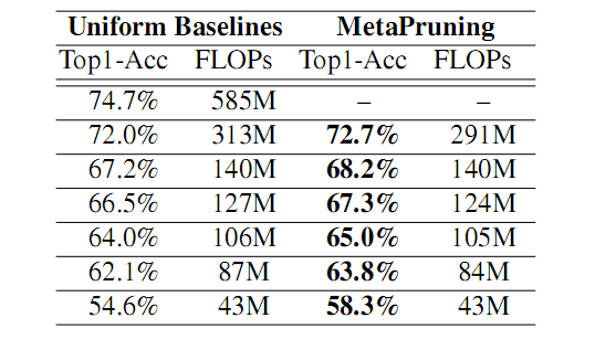 图(3)(4)表明 metaPruning 相比较一般基线模型相比,metaPruning 得到的结构在效率和 top1 上都有较大的优势。