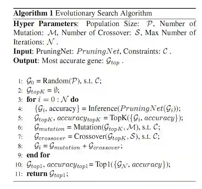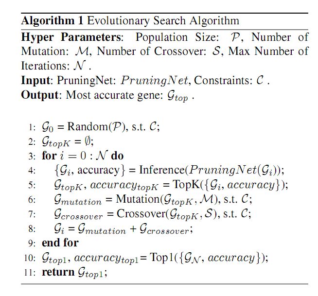 本文中,网络向量编码为 pruned networks 的基因。在硬约束的前提下,我们首先随机选择大量的基因并获得相关的剪枝网络的准确率。选择前 top k 的基因,对其做变异和交叉,生成新的基因。同时对不符合要求的基因添加约束来消除。如此迭代数次,最终可以得到既满足约束又获得最高准确率的基因。具体算法如图(2)所示: