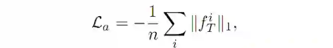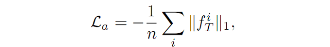 (2)La 表示激活损失,如果一个输入图像是真实的图像而不是随机向量生成的,那么在 D 网络中,经过 D 提取进过全连接层之前得到的输出值 ft,其激活值应该为一个较高的值。所以,La 可以表示为如下的公式:
