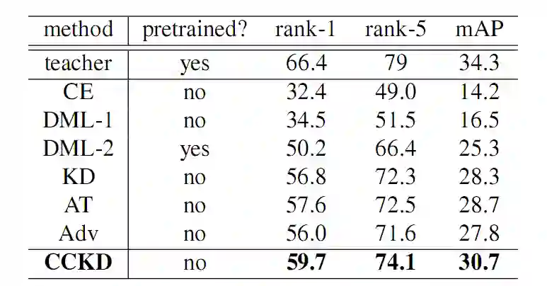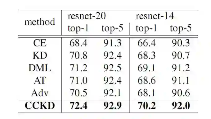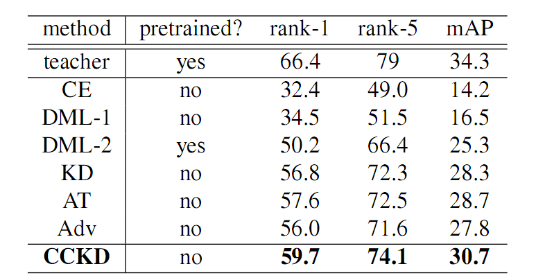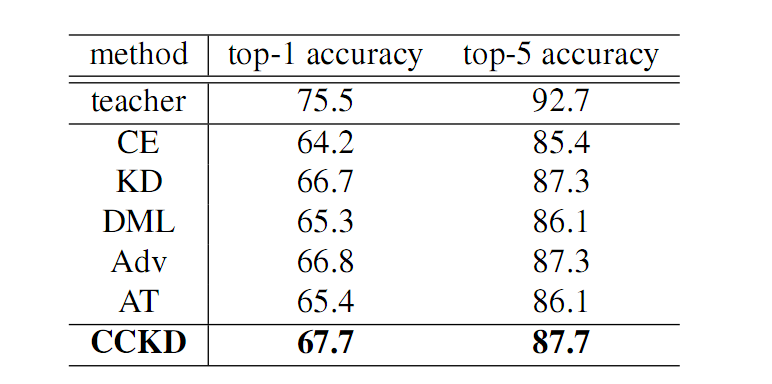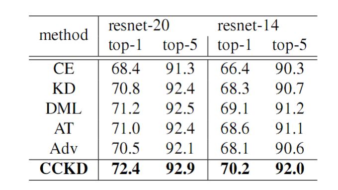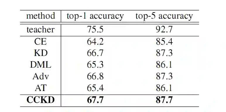 其中 Lce 为交叉熵所示,Lkd 为 t-s 之间的实例层的蒸馏损失,Lcc 则是实例间一致性的损失。