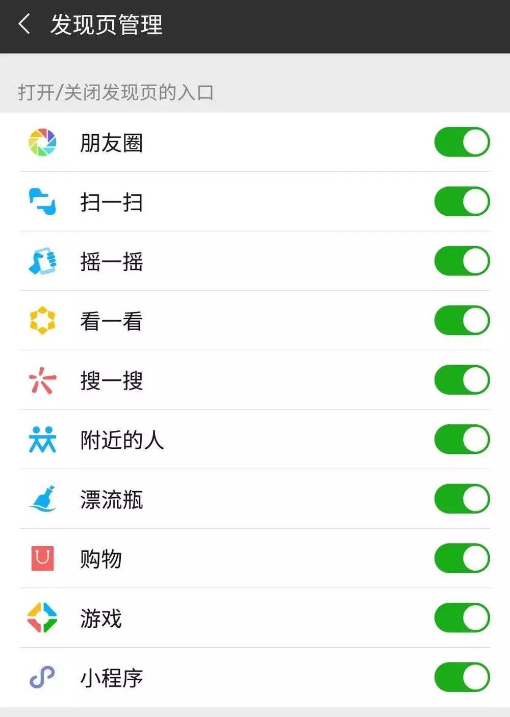 这么大体量的产品,设计依然很简洁,和臃肿的微博、淘宝、QQ比起来,完全是一股清流。甚至,它连自己最重要的流量入口(发现页面),都允许用户自定义,你可以关闭包括朋友圈、游戏在内的所有入口,这对其它中国互联网产品来说简直天方夜谭了。