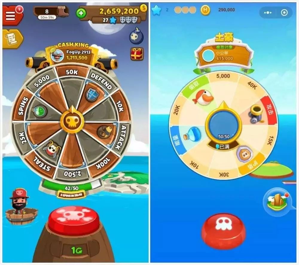 首先《Pirate Kings》其实也是个社交游戏,有Facebook的好友关系链导入,所以曹晓刚口中的“把单机游戏进行社交改造”一开始就不成立。而在两款游戏的主界面里,你可以直观地看到:上部的经验值、护盾、金币数,以及转盘的四个主要玩法:攻击、偷取、护盾、能量,转盘上方显示的“土豪”目标,转盘按钮等元素基本一致。