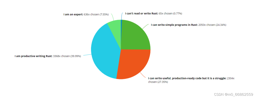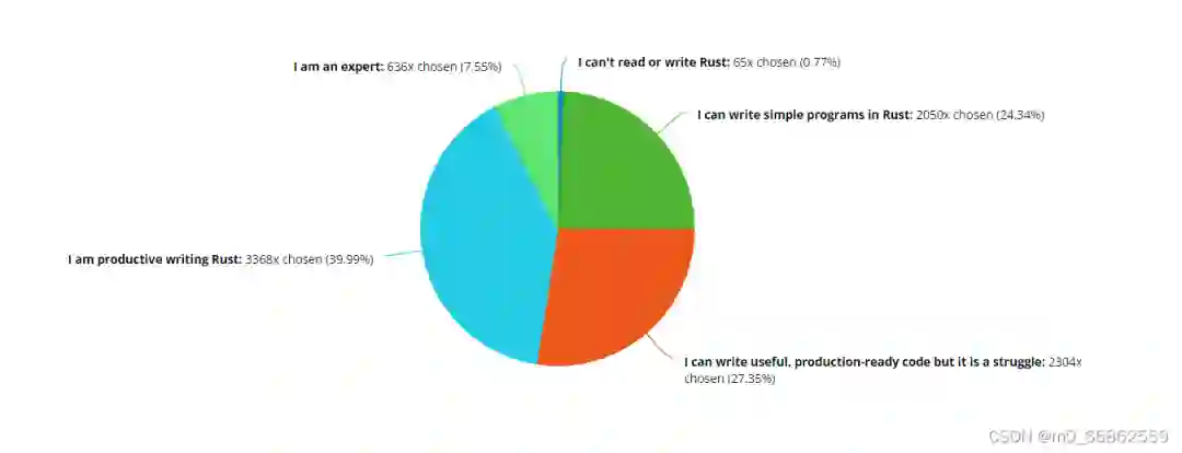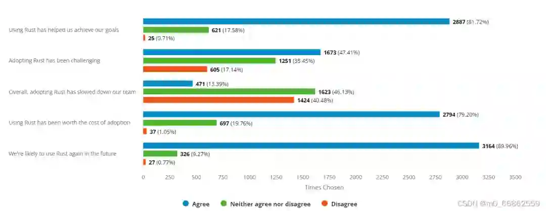 总而言之,多数Rustaceans(使用 Rust、为 Rust 做出贡献或对 Rust 的开发感兴趣的人)在使用Rust编写程序时感觉很满意,只有1%的人表示使用它很不方便,还有四分之一的人认为Rust与其他编程语言相比没有任何的优势。