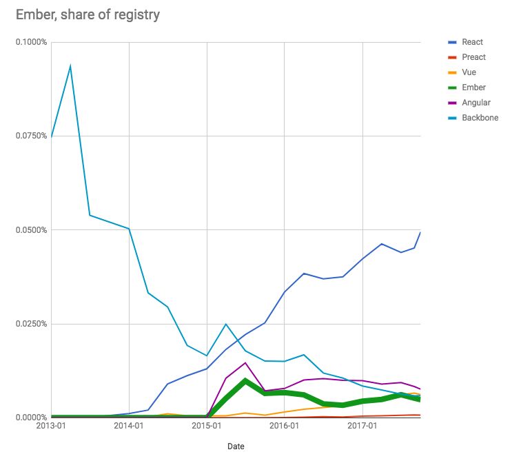 Ember 已经卷土重来。这个框架曾被许多大公司所使用,例如微软、Netflix 和 Salesforce。在 2016 年人气下降之后,去年下载量增长了 45%。