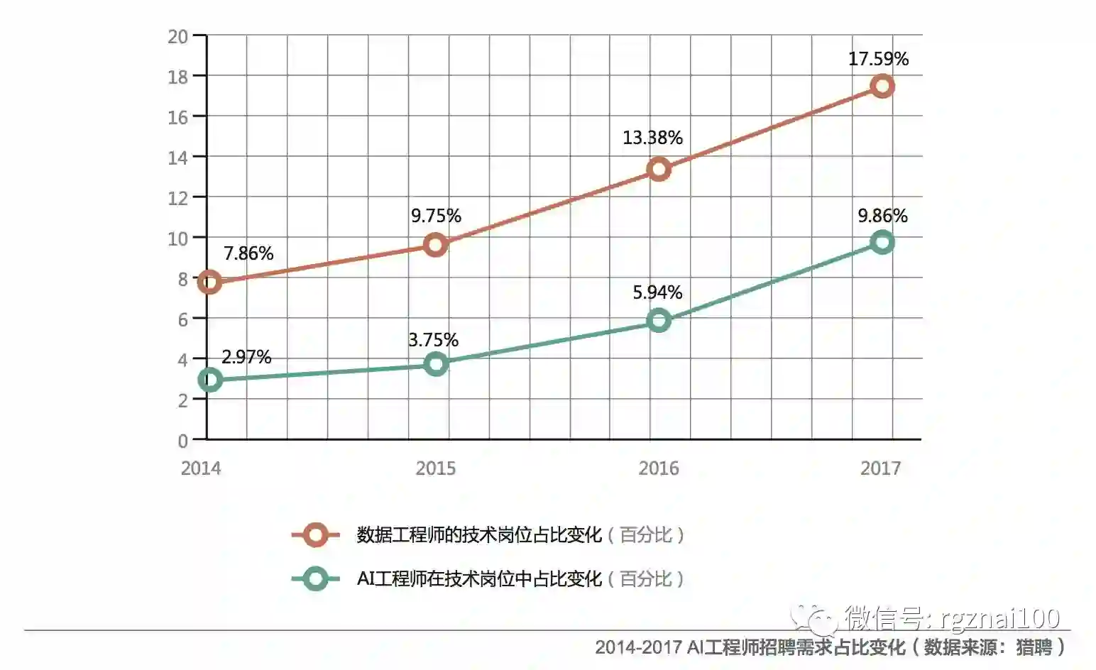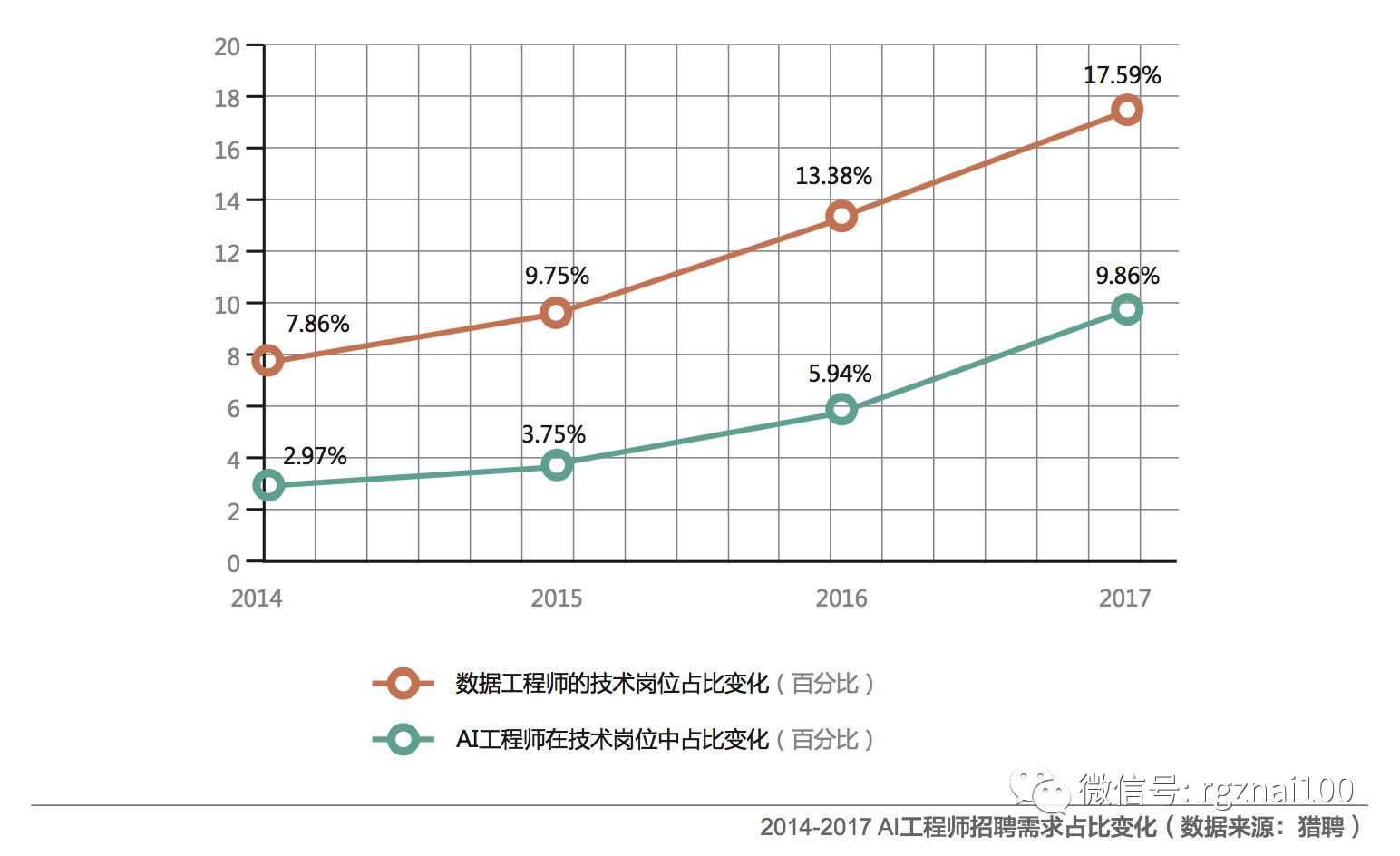 2017年,AI类工程师在全部IT技术招聘岗位中的占比为9.86%,是2014年的8.8倍。