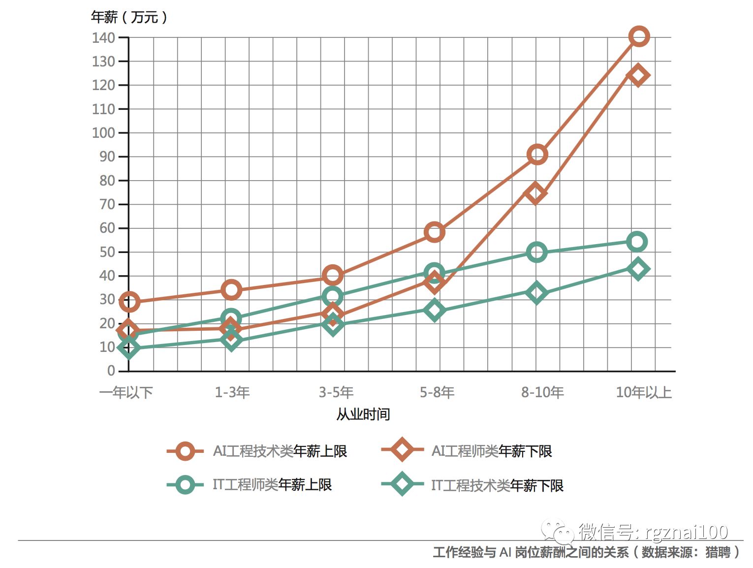 十年以上工作经验的AI工程师,最高年薪可达140万,而10年以上工作经验的普通IT工程师的最高年薪还不到55万。