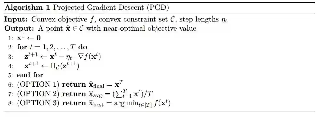 投影梯度下降算法已在算法 1 中陈述。该过程通过采取以梯度为指导的步骤生成迭代 x_t,以努力减少局部函数值。最后,它返回最后的迭代,平均迭代或者最佳的迭代。