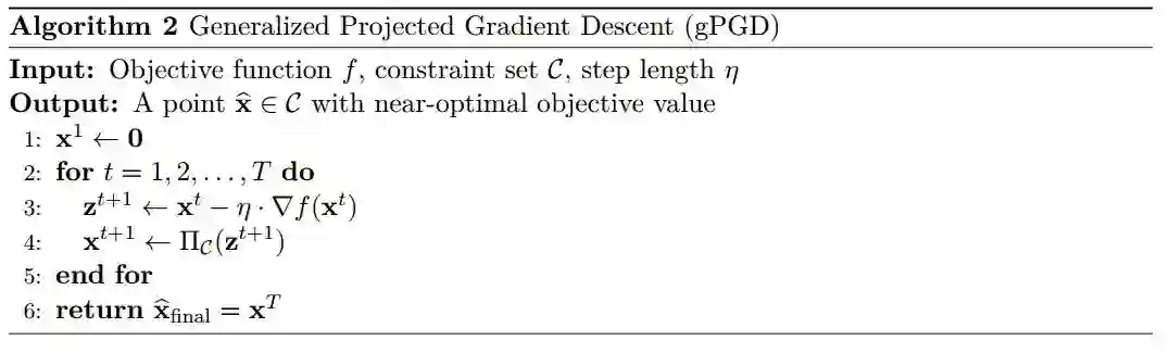 算法 2 概述了用于解决非凸优化问题的广义投影梯度算法(gPGD)的过程。读者将会发现这非常类似于算法 1 之中的 PGD。然而,一个关键的区别是所做的投影:PGD 利用了凸投影,而 gPGD 利用了非凸投影(如果涉及到一个非凸约束集 C)。