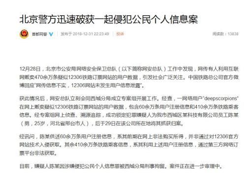 据北京市公安局网络安全保卫总队微博消息,北京警方破获一起侵犯公民个人信息案,网上贩卖 470 余万条疑似 12306 铁路订票网站用户数据的犯罪嫌疑人陈某,已被刑拘。