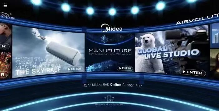 在第 127 届广交会中,美的通过保利威直播打造沉浸式数字门户页面,将研讨会场景、空降拆机直播、 全球直播间、新品宣传视频等直播内容于一体, 为观众提供快速直达意向直播间的入口。