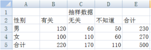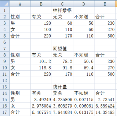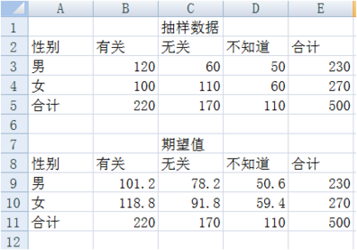 求解男女对收入与性别相关不同看法的期望次数,这里采用所在行列的合计值的乘机除以总计值来计算每一个期望值,在单元格 B9 中键入“=B5*E3/E5”,同理求出其他值。