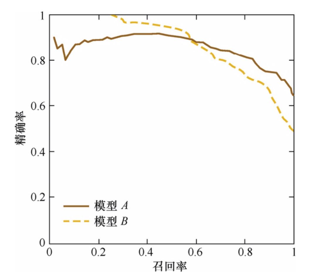 我们可以看到不同召回率下模型 A 和模型 B 的精确率表现不同,所以如果只对某点来衡量模型的性能是非常片面的,而只有通过 P-R 曲线的整体表现才能够进行更为全面的评估。