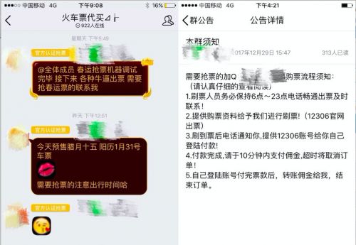 以QQ群为例,搜索“代抢春运火车票”、“火车票代买”等关键词,有上百个相关QQ群,这些群人数大多在几百人,多的可达上千人。群里发布的都是黄牛抢票成功的信息截图,有的群还会以公告的形式统一说明购票流程。