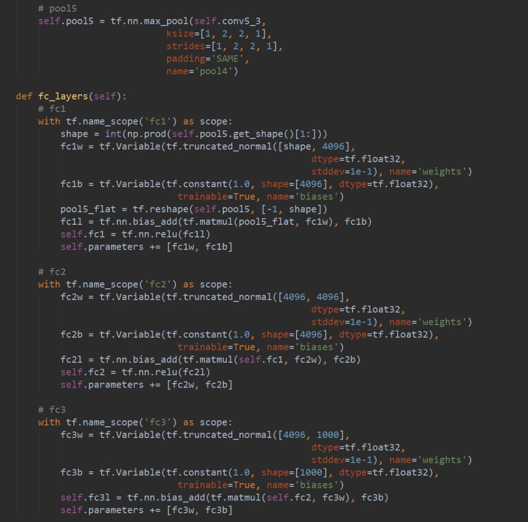 原本自己利用 Tensoflow 简单写了个 VGG16 的网络结构,但去谷歌一搜发现别人的代码写的实在太好了,以至于这里就不用自己代码展示 VGG16 了。编写的思路无非就是定义卷积过程、池化过程和全连接过程,然后将其封装到 VGG16 的模型函数中去,其中注意一些编写细节即可。