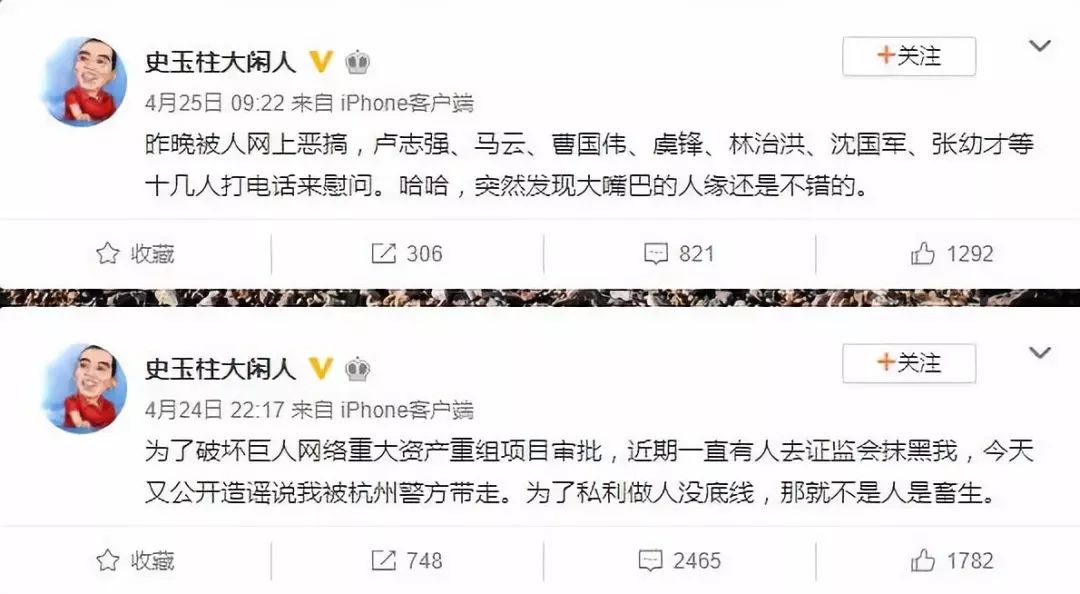 这事儿起因是有人在造谣,说史玉柱在杭州被警方带走。他当然有理由愤怒,从去年发博被威胁人生安全,到现在有人造谣他被警察抓走。史玉柱不止心里苦,还自称不敢在美国喝酒。