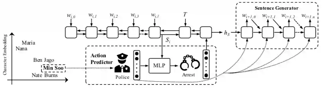 此外,给定的角色在故事生成过程的每一步都指导着动作选择操作,以促进角色的一致性。在对话系统(Li et al. 2016)中也验证了这种策略可以提高说话人在神经响应生成中的一致性。