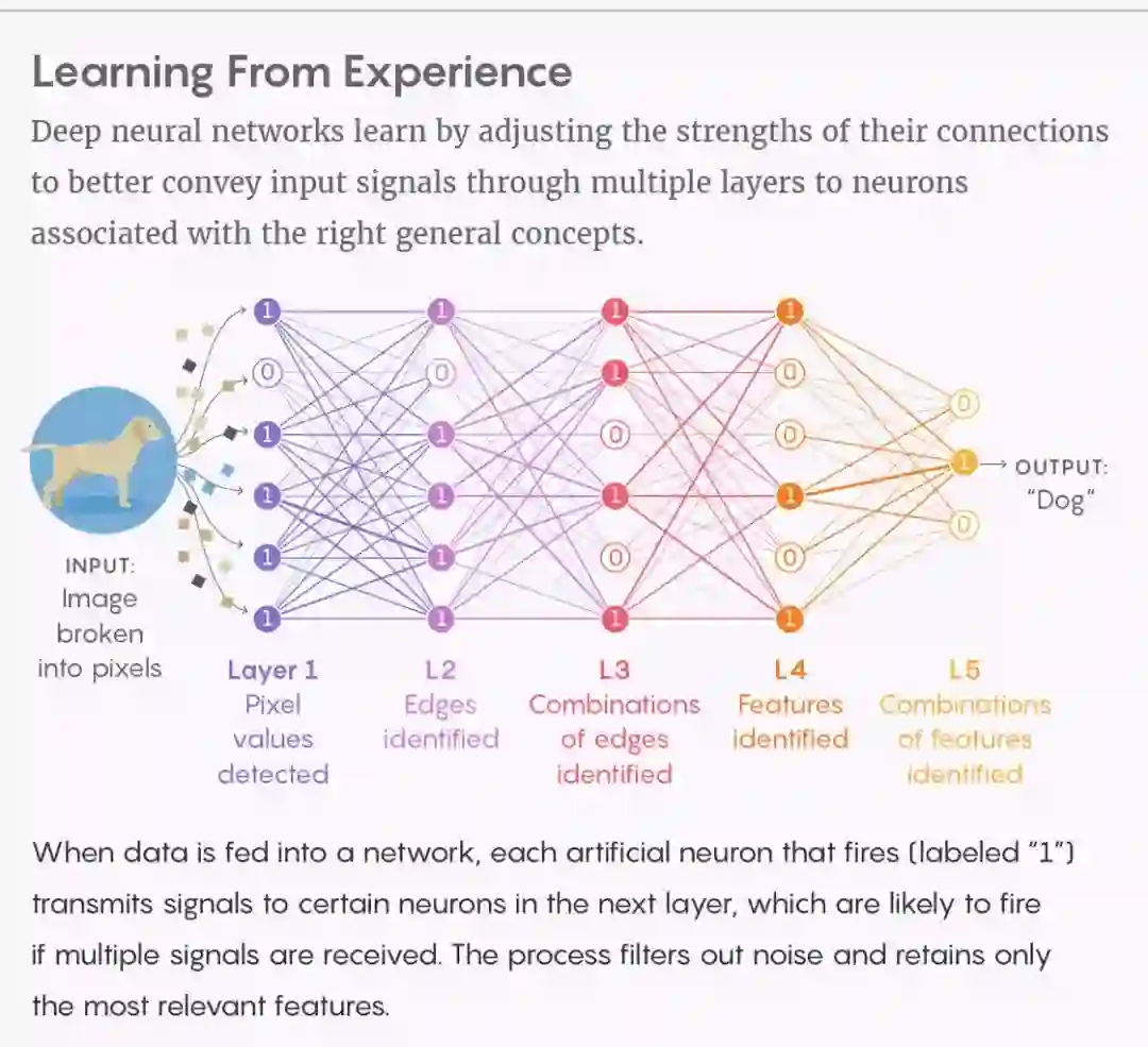 非常重要的一点是,网络的线路不是预先固定的,而是在不断尝试和错误的过程中进行调整的。这个网络可能会被“喂”进标签是小猫或小狗的图片。对于每个图片,它分配一个标签, 检查它是否和图片自己的标签一致,如果不是,则调整神经元之间的连接。一开始它的猜测是随机的,但是会慢慢变得更好;在大约10000次尝试之后,它知道了怎么区分小猫和小狗。一个神经网络甚至可以有十亿个互连, 所有这些互连参数都需要调整。