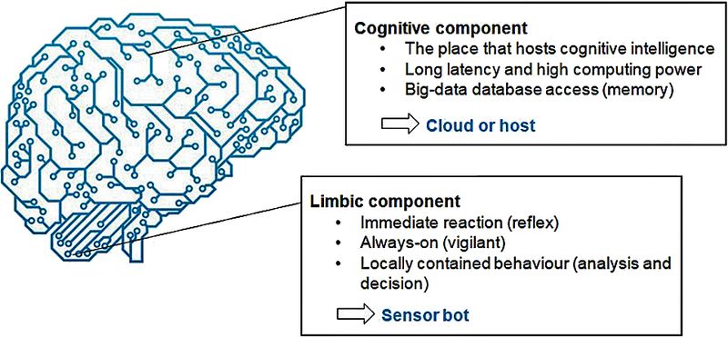 在这一点,将传感器系统处理数据的方法与人脑的功能相关联来理解。人类大脑有两个主要系统来处理数据:认知和边缘。认知水平对应云计算,云计算具备高处理能力和大内存,但会出现信息延迟。相反,边缘系统是原始的、反应性的和反射性的,这对应于传感器系统中的局部处理,即边缘计算。