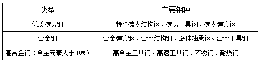 我国将特殊钢分成优质碳素钢、合金钢、高合金钢(合金元素大于10%)三大类,其中合金钢和高合金钢占特殊钢产量的70%。其中碳素钢是指含碳量wc小于2%的铁碳合金,碳钢除含碳外一般还含有少量的硅、锰、硫、磷;合金钢是指合金元素有硅、锰、钼、镍、铬、钒、钛、铌、硼、铅、稀土等其中的一种或几种合金元素的钢。