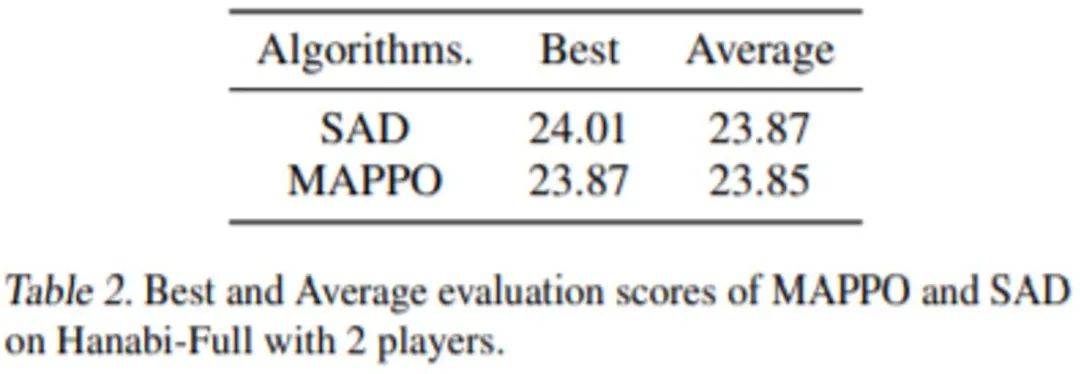表 2:MAPPO 和 SAD 在 2 个玩家的 Hanabi-Full 任务的得分对比。