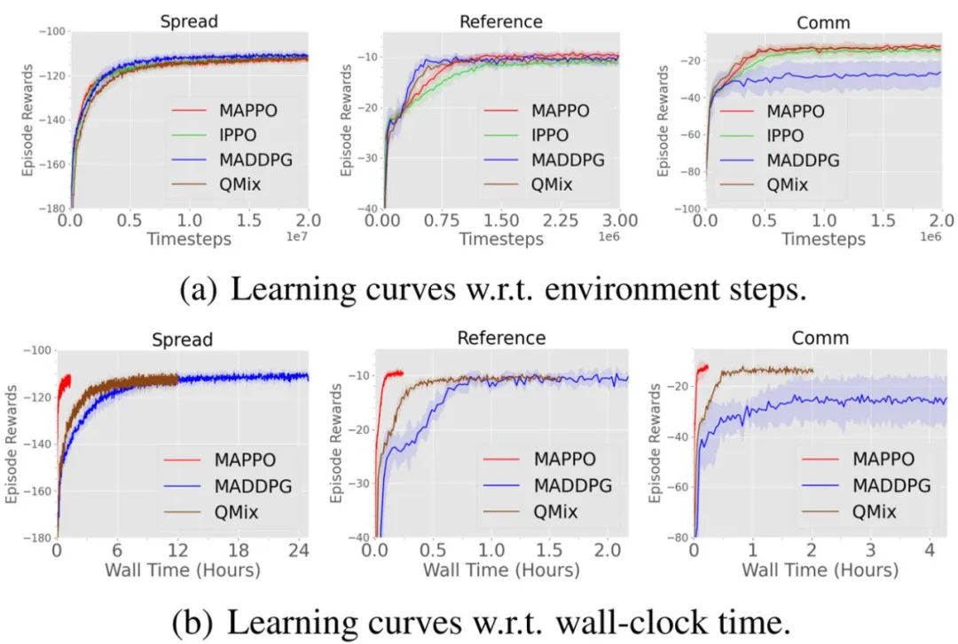 在有限计算资源的条件下,与 off-policy 算法相比,on-policy 算法 --MAPPO(Multi-Agent PPO)具有显著高的算法运行效率和与之相当(甚至更高)的数据样本效率。