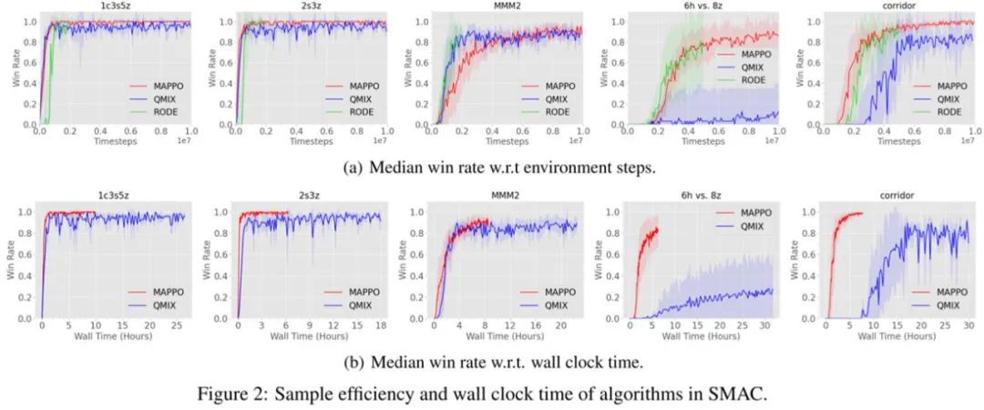 从图 4 可以看出与其他算法相比,MAPPO 不仅具有相当的数据样本效率和性能表现(performance)(图(a)),同时还具有显著高的算法运行效率(图(b))。