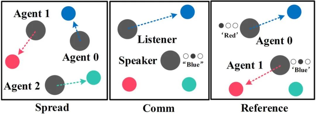 图 1:MPE 环境中的 3 个子任务:Spread,Comm 和 Reference