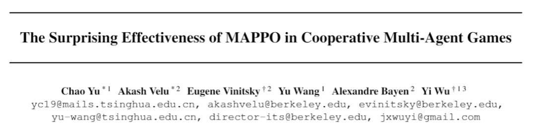 所以,如果你的 MARL 算法一直不 work,不妨参考一下这项研究,有可能是你没有用对算法;如果你专注于研究 MARL 算法,不妨尝试将 MAPPO 作为 baseline,说不定可以提高任务基准;如果你处于 MARL 研究入门阶段,这套源码值得拥有,据说开发完备,简单易上手。这篇论文由清华大学的汪玉、吴翼等人与 UC 伯克利的研究者合作完成。研究者后续会持续开源更多优化后的算法及任务(仓库指路:https://github.com/marlbenchmark)