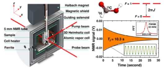 实验中,零磁场下极其微弱的核磁共振信号的测量采用了极其灵敏的原子磁力计(atomic magnetometer)作为探测器,其灵敏度达到了10 fT/√Hz。将探测器与样品一直放置于小于0.1 nT(10-10 T)磁场的屏蔽桶内,此时样品产生的微小磁场信号也能够被原子磁力计捕获到,可实现在零磁场下对核自旋体系的精密测量。基于这强有力的探测手段,课题组测量了同位素标记液体甲酸分子,观测到甲酸分子在零磁场环境下,弛豫时间(T2)达到了10.3秒,谱线的分辨率达到了32 mHz,该实验结果超过了传统核磁共振的谱线分辨率,展示了利用零磁场核磁共振实现的高分辨率谱学,而高分辨率谱学对生物、医学、化学等领域具有重要的应用。