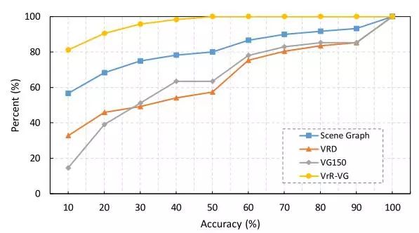 通过VD-Net的学习,可以发现现有的数据集中,关系预测具有很高的准确率,在VG150中,37%的标签在VD-Net中有至少50%的准确率。