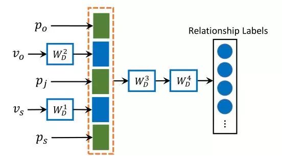 为了避免过拟合,网络设计需要尽可能的小。网络包含4个全连接层,其中,,分别是主体、客体的位置编码及二者联合位置编码。,分别是主体、客体对象的类别词向量。