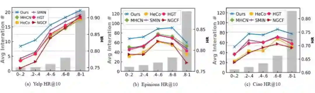 实验结果图清楚地表示了我们模型在不同数据稀疏情况的较好的模型表现,模型效果的优越性可能来自于模型中基于跨视图知识转换的对比学习的作用,因为它可以有效地捕捉到特定于用户的社交关系的影响和特定于商品的语义相关性。
