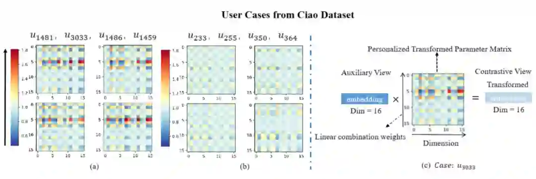 模型通过结合异质图对比学习和元神经网络,实现了自适应的跨视图对比数据增强,以适应用户个性化的特质。实验结果表明,模型能够成功捕捉用户之间的差异,并根据这些差异进行相应的调整数据增强,从而进一步提升推荐性能。