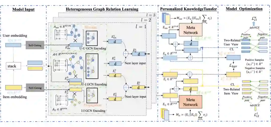 但是直接使用它来实现异构图关系学习是具有挑战性,因为辅助信息域视角和用户-商品交互信息域视角之间的依赖关系不是固定的而是多样性的。例如,由于样本个性化特质和各式的特定于用户的行为模式导致不同的用户受朋友影响是不同的。从而盲目的增强用户的偏好特征学习没有考虑每个个体行为的特性会带来模型的次优化效果。总之,此模型需要解决以下两个问题:1)如何实现有效地跨关系视角的知识转换;2)如何实现个性化增强的异构图对比学习。