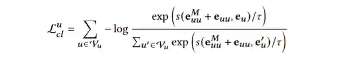 将对齐后的辅助域特征,而不是原始异质关系学习模块输出的辅助域特征,与交互关系视角的特征进行对比学习,用户侧的 InfoNCE 损失函数表达式: