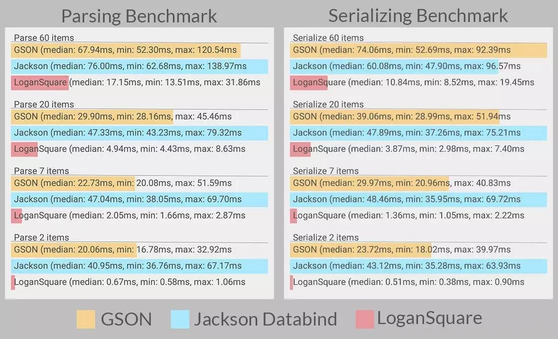 LoganSquare是近两年崛起的快速解析和序列化JSON的Android函数库,其底层基于jackson的streaming API,使用APT(Android Annotation Tool)实现编译时注解,从而提高JSON解析和序列化的性能。官网上可以看到LoganSquare和gson、jackson databind的性能对比。