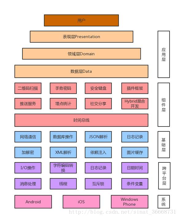 基于以上设计原则,我们可以看出APP架构图,最上层是应用层,应用层以下都属于基础框架层,基础框架层包括:组件层、基础层和跨平台层。
