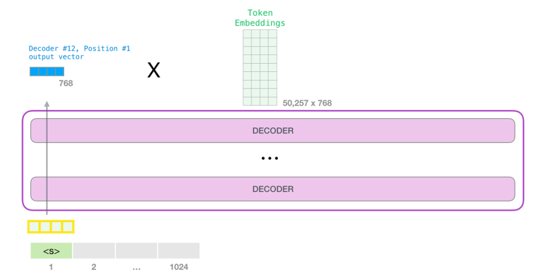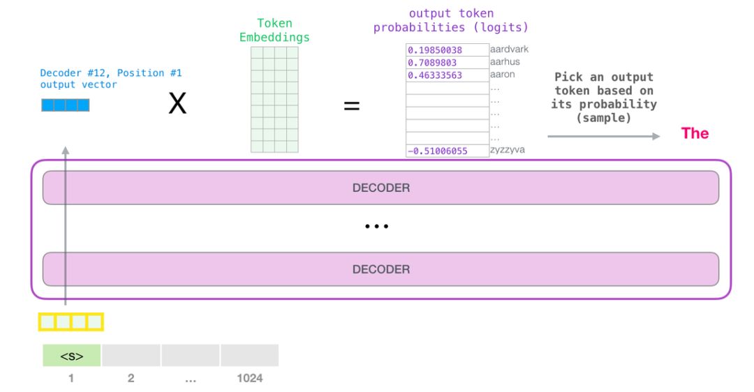 当最后一个 transformer 模块产生输出之后(即经过了它自注意力层和神经网络层的处理),模型会将输出的向量乘上嵌入矩阵。