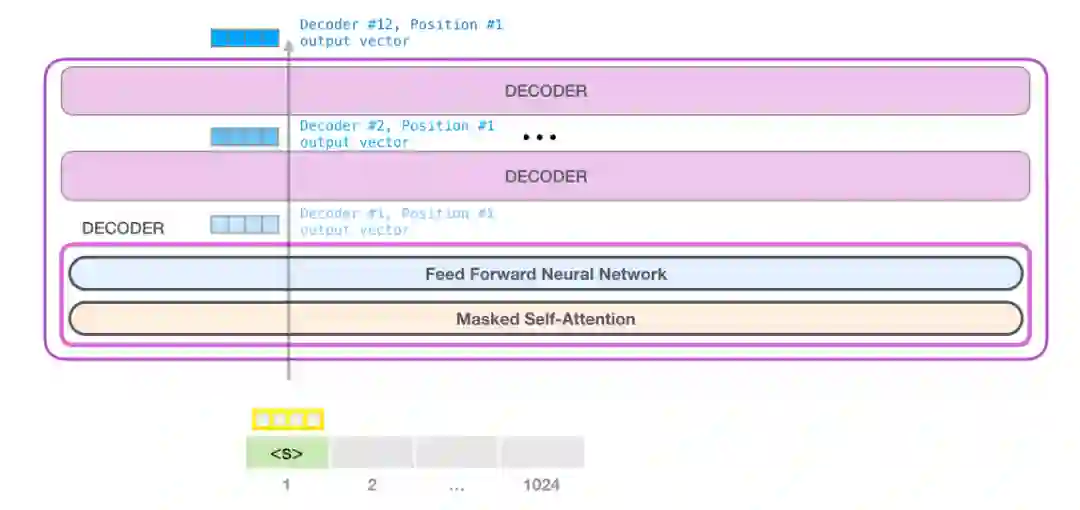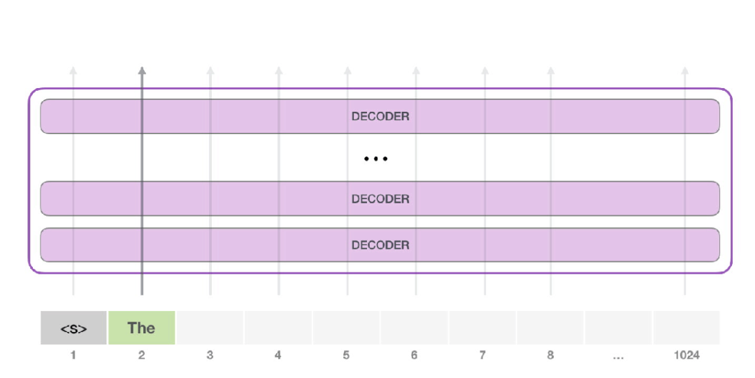 举的例子其实是 GPT-2 在「推断/评价」(inference / evaluation)模式下运行的流程,所以一次只处理一个单词。在训练过程中,模型会在更长的文本序列上进行训练,并且一次处理多个词(token)。训练过程的批处理大小(batch size)也更大(512),而评价时的批处理大小只有 1。