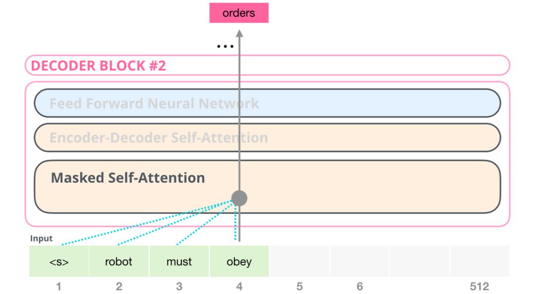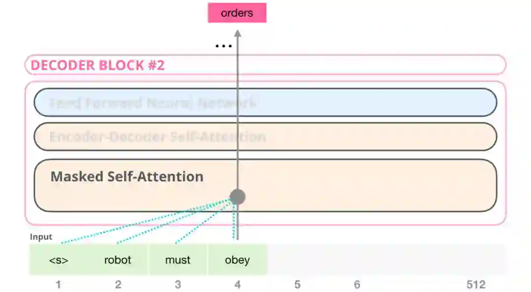 举个例子,如果我们重点关注 4 号位置单词及其前续路径,我们可以模型只允许注意当前计算的单词以及之前的单词: