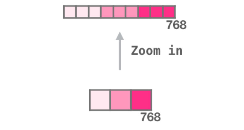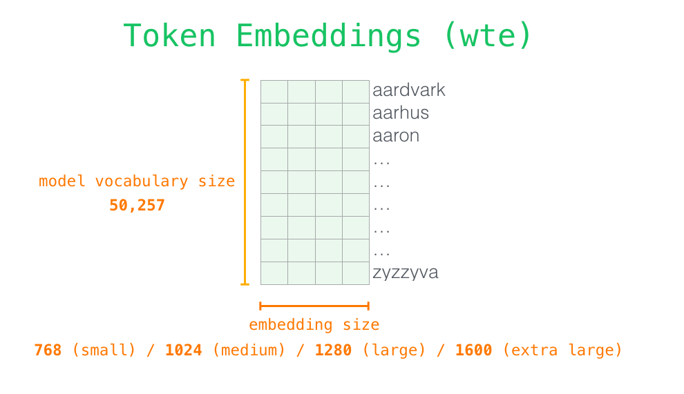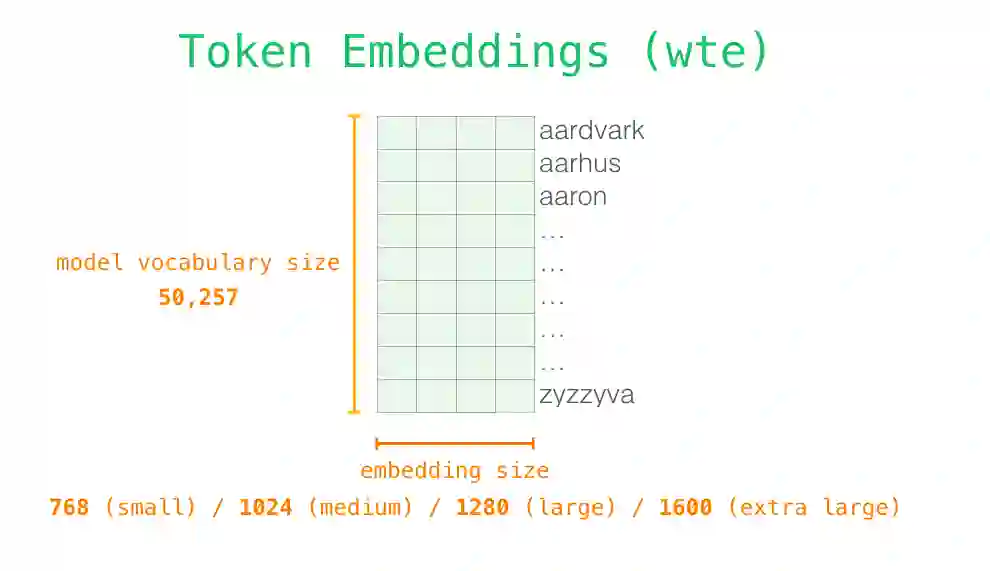 嵌入向量的长度和 GPT-2 模型的大小有关,最小的模型使用了长为 768 的嵌入向量来表征一个单词。